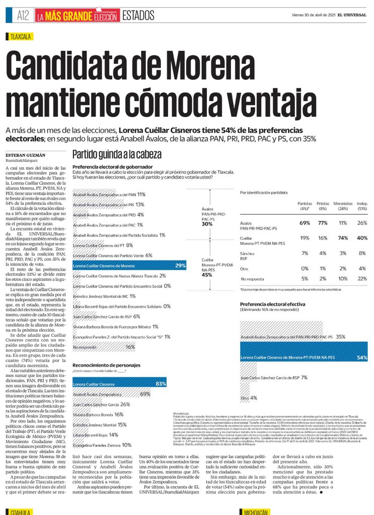 Tlaxcala, Tlax; 30 de abril de 2021 (Pulso) La encuesta estatal en viviendas, aplicada en Tlaxcala por el El Universal/Buendía&Márquez, señala que la ventaja de Lorena Cuéllar Cisneros, eal día de hoy, tiene un 54% de preferencia efectiva, y da conocer además que la candidata de la coalición Juntos Haremos Historia en Tlaxcala estaría a la cabeza, ya que el voto independiente o apartidista en el estado representa la mitad del electorado y explica que en este segmento, cuatro de cada diez tlaxcaltecas señaló que votarían por la candidata de la alianza Juntos Haremos Historia en Tlaxcala.
