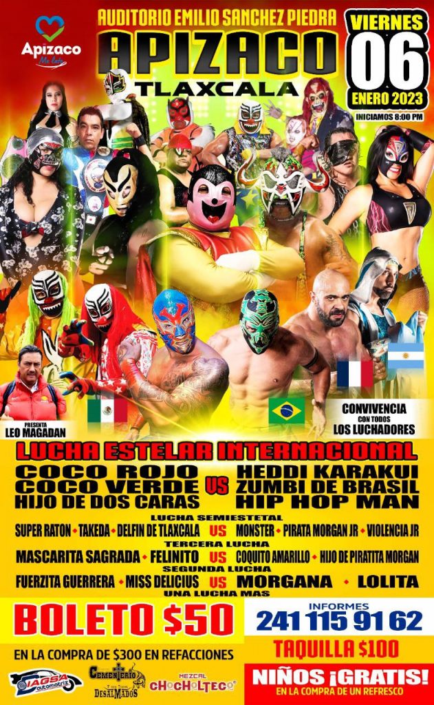 Apizaco, Tlax; 3 de enero de 2023 (PulsoRed) El Gobierno de #Apizaco te invita a la gran función de lucha libre 🤼♂️ de Día de Reyes 👑👑👑 este viernes 06 de enero, en el Auditorio Emilio Sánchez Piedras a las 8:00 pm