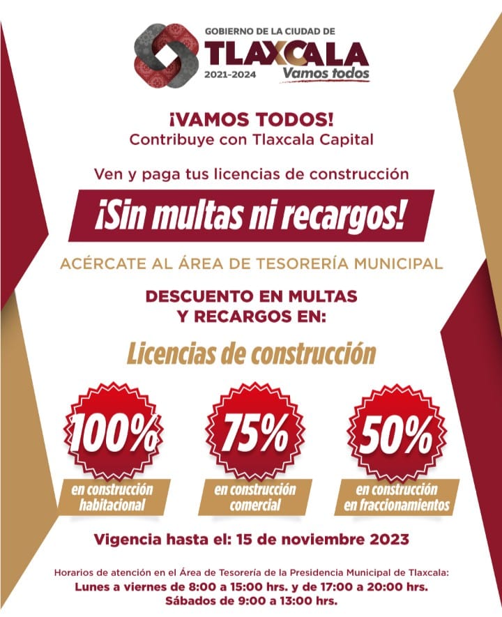 Los contribuyentes puedes acudir para este benefició a las áreas de tesorería y obras públicas, en la presidencia municipal de Tlaxcala, según sea el caso, en un horario de lunes a viernes de 9:00 a 15:00 horas y de 17:00 a 20:00 horas y los sábados de 9:00 a 13:00 horas.