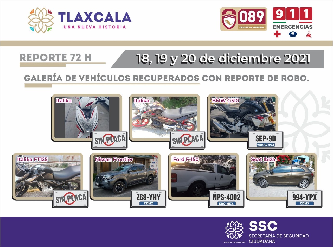 Tlaxcala, Tlax; 20 de diciembre de 2021 (Pulso Red) Como resultado de los operativos constantes de seguridad y vigilancia para la prevención y combate del delito de robo de vehículos a través del uso de tecnologías de rastreo, así como el Servicio de Emergencias 911, la Secretaría de Seguridad Ciudadana (SSC) recuperó siete unidades vehiculares en diferentes acciones durante el fin de semana, detuvo a dos personas.