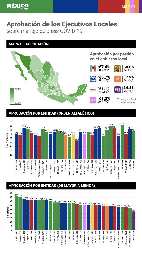 Mena Rodríguez se posicionó en el primer lugar de aprobación del manejo de la crisis del nuevo coronavirus con un 81.3 por ciento de aprobación entre los tlaxcaltecas y el 69.4 por ciento de opiniones positivas o en aprobación general.