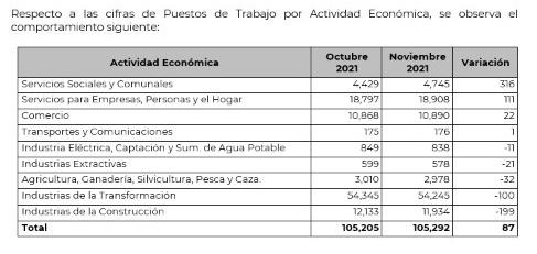 El penúltimo mes del 2021 cerró en total con más de 105 mil 200 empleos pasando de 105 mil 205 empleos en octubre pasado, a 105 mil 292 puestos.