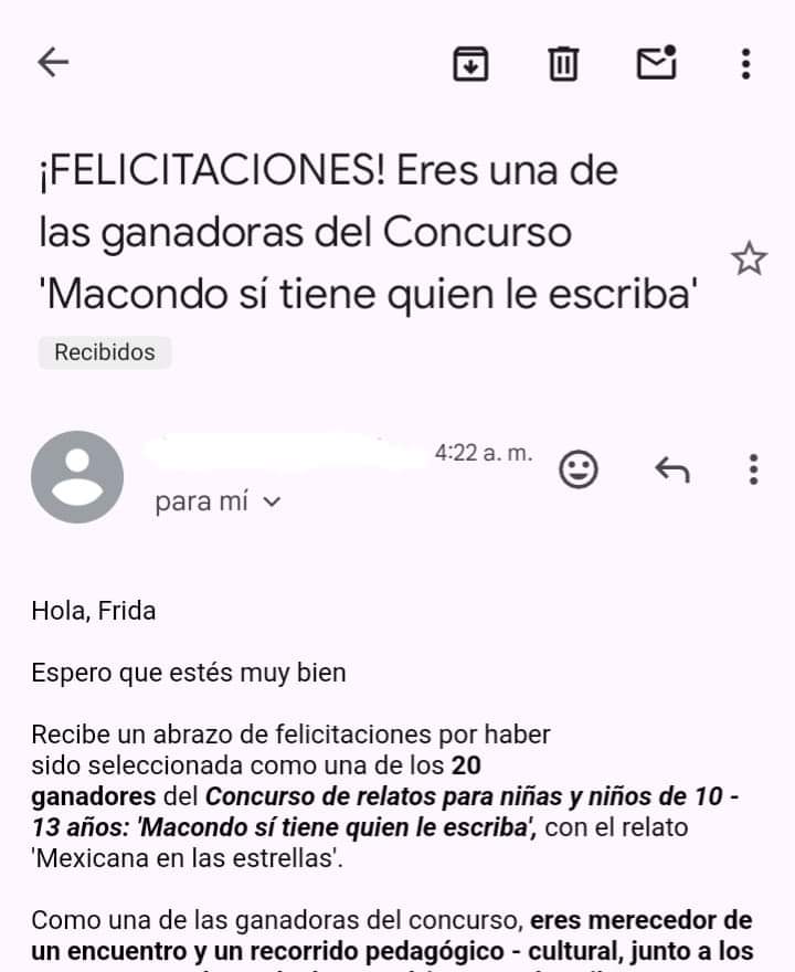 A través de sus redes sociales, Karen Sharon Martínez Velázquez, madre de la niña, dio a conocer los resultados de la convocatoria emitida por la Red de Periodismo Cultural y la Fundación Gabo, en los que resaltó el nombre de Frida.