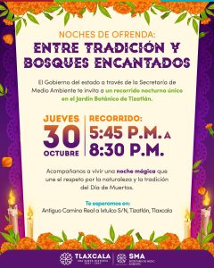 Tlaxcala, Tlax; 29 de octubre de 2025 (PulsoRed) La Secretaría de Medio Ambiente (SMA) invita a la ciudadanía a disfrutar de “Noches de Ofrenda: Entre Tradición y Bosques Encantados”, un recorrido nocturno que se llevará a cabo este 30 de octubre en el Jardín Botánico de Tizatlán, de 17:45 a 20:30 horas, donde el arte, la tradición y la sustentabilidad se unirán para rendir homenaje a una de las celebraciones más emblemáticas de México.