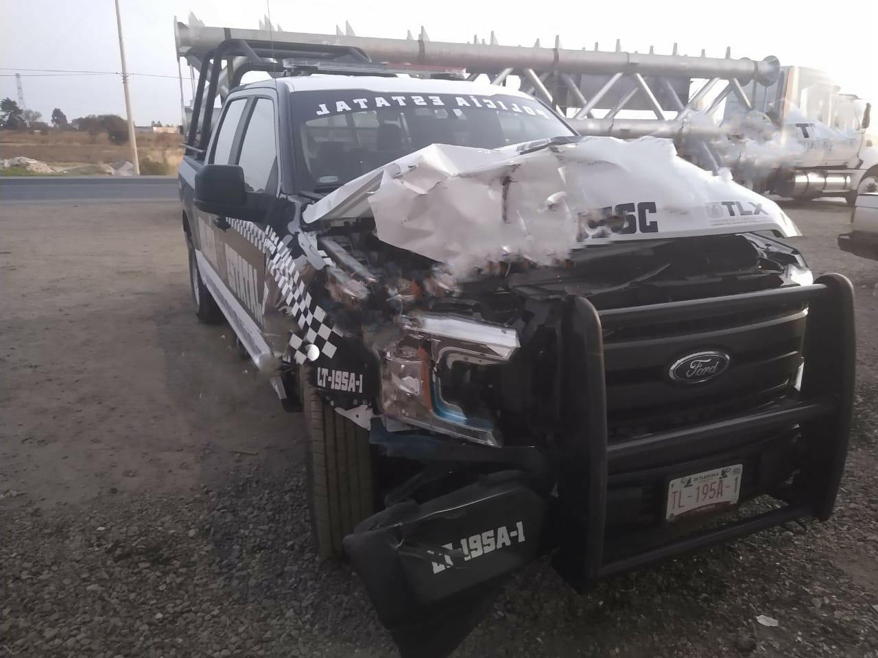 Calpulalpan, Tlax. 12 de diciembre de 2019 (Rommel Pichardo) A menos de 24 horas del banderazo de arranque del Operativo Coordinado Invierno 2019 sobre la carretera federal México-Veracruz, una de las nuevas patrullas adquiridas para la policía estatal se vio involucrada en un hecho de tránsito tipo choque a la altura del municipio de Calpulalpan en Tlaxcala; que sólo dejó daños materiales, principalmente a la unidad oficial.