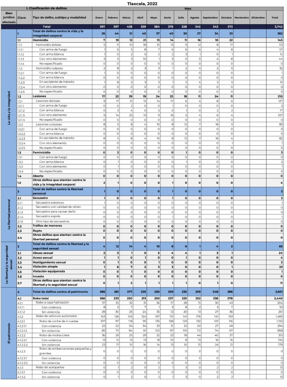 Tlaxcala, Tlax; 12 de diciembre de 2022 (Ariadna Castro) Al cierre del mes de octubre se registraron 22 homicidios en el estado de Tlaxcala, lo que significó que fue el mes con más homicidios en el año.