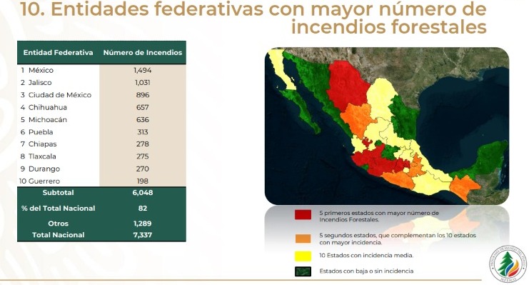 La entidad se ubica en este momento en el octavo lugar en el plano nacional con mayor número de incendios, mientras que el Estado de México encabeza la lista con mil 494 siniestros, seguido de Jalisco con mil 31, la Ciudad de México con 896 incendios, después se ubica Chihuahua con 657 casos, Michoacán 636, Puebla con 313 incendios, Chiapas 278, Durango 270 incendios y Guerrero con 198 siniestros.