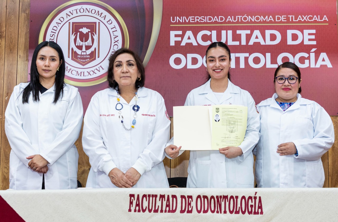 El documento otorgado a la nueva profesionista avala la formación académica recibida a lo largo de nueve semestres en la Licenciatura en Cirujano Dentista. A este significativo acto se dieron cita estudiantes, docentes y familiares, así como el jurado examinador que estuvo integrado por la Doctora Elvia Ortiz Ortiz, Docente y Coordinadora General de Planeación Institucional; y por las Cirujano Dentistas Nohemí Lima Hernández y Noemí Belmont Rodríguez, quienes coincidieron en resaltar que a lo largo de su devenir histórico esta Facultad ha contribuido a resolver los problemas de salud bucal de los tlaxcaltecas y de pacientes de otras regiones del país y del extranjero.