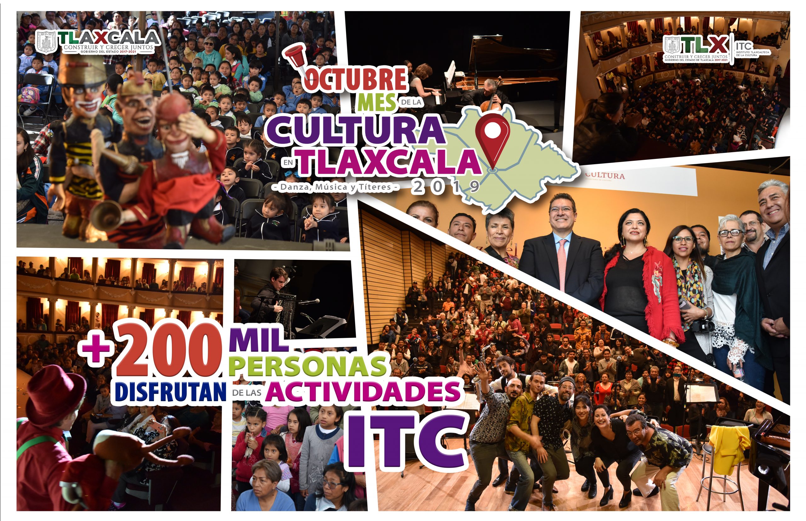 El titular del ITC, agregó que eventos importantes como la inauguración del Complejo Artístico “A 500 Años”, en el Centro de las Artes; la extensión del Festival Internacional Cervantino edición 2019; la realización del Festival Internacional de Títeres “Rosete Aranda”; el Encuentro Nacional de Fonotecas; Conciertos de temporada; Obras de teatro; Presentaciones de danza; Conferencias; Presentaciones de libros; Exposiciones, Homenajes; así como el circuito de “Tlaxcalateatro”, y actualmente el pabellón cultural que se encuentra en el Centro de Convenciones en el marco de la Feria Tlaxcala 2019; son una muestra de amplia oferta cultural que se realizó sólo en el mes de octubre del año en curso.