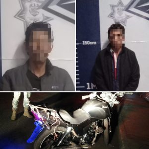 Los sujetos identificados como Federico N., alias «El Kiko», de 44 años de edad, originario del municipio de Calpulalpan, y José Armando N., alias «La Ardilla» de 50, con residencia en el Estado de México, fueron reportados a traves de una denuncia ciudadana alterando el orden público a bordo de una motocicleta en las inmediaciones del mercado «Santa Rosa».