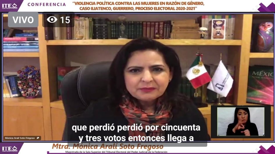 A invitación del Instituto Tlaxcalteca de Elecciones (ITE), la magistrada dictó este jueves una conferencia virtual sobre la resolución de la Sala Regional del TEPJF en el caso de Iliatenco, Guerrero, mediante la que fue declarada la nulidad de una elección por violencia de género contra una candidata a presidenta municipal.