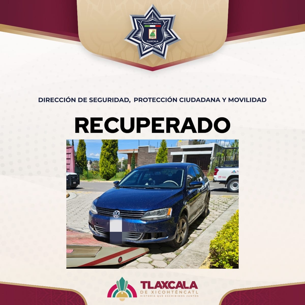 Tlaxcala, Tlax; 15 de septiembre de 2025 (PulsoRed) Elementos de la policía municipal lograron recuperar un automóvil que habría sido robado con violencia a una persona en el fraccionamiento Lomas NUI, en Tlacomulco, de la comunidad de Ocotlán.
