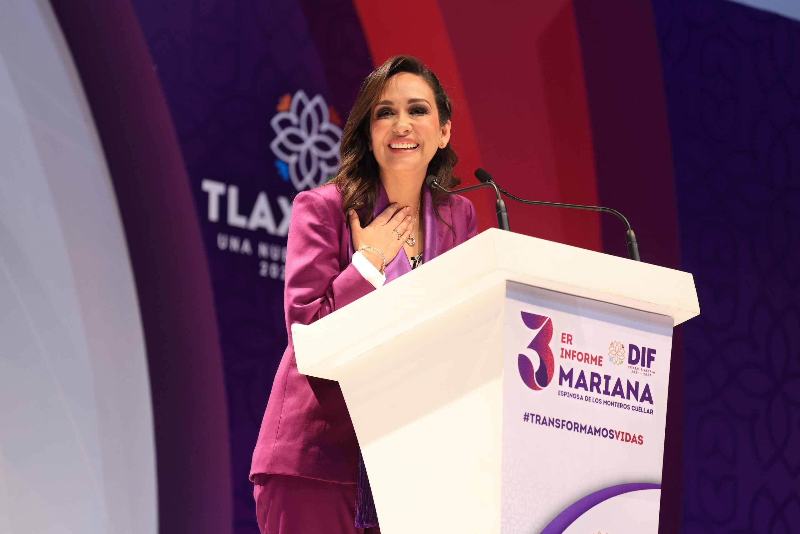 “Cuando trabajamos en equipo no solo impulsamos proyectos, transformamos vidas y construimos sueños”, sostuvo la presidenta honorífica del organismo, Mariana Espinosa de los Monteros Cuéllar, al emitir un mensaje con motivo del Tercer Informe de Actividades del Sedif, que se llevó a cabo en el Centro Cultural Universitario, en el que enfatizó que, al poner a las personas en el centro de las acciones institucionales se transforma Tlaxcala.
