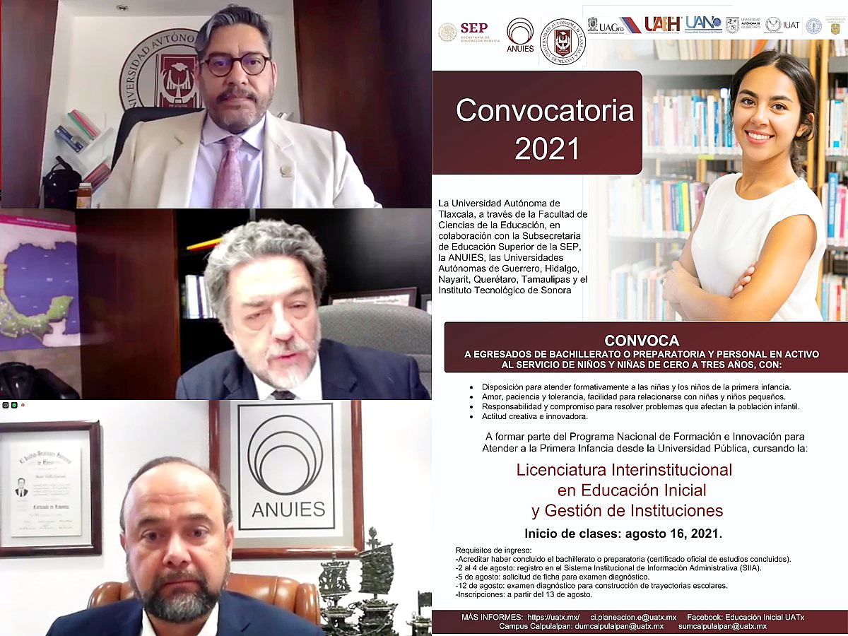 Tlaxcala, Tlax; 5 de agosto de 2021 (Pulso) Para propiciar los escenarios de formación y actualización en materia de atención a la primera infancia, la Universidad Autónoma de Tlaxcala (UATx), a través de la Facultad de Ciencias de la Educación, en coordinación con la Subsecretaría de Educación Superior de la SEP, la Asociación Nacional de Universidades e Instituciones de Educación Superior (ANUIES), las Universidades Autónomas de Guerrero, Hidalgo, Nayarit, Querétaro y Tamaulipas, así como el Instituto Tecnológico de Sonora, abrieron la convocatoria para cursar la Licenciatura en Educación Inicial y Gestión de Instituciones.
