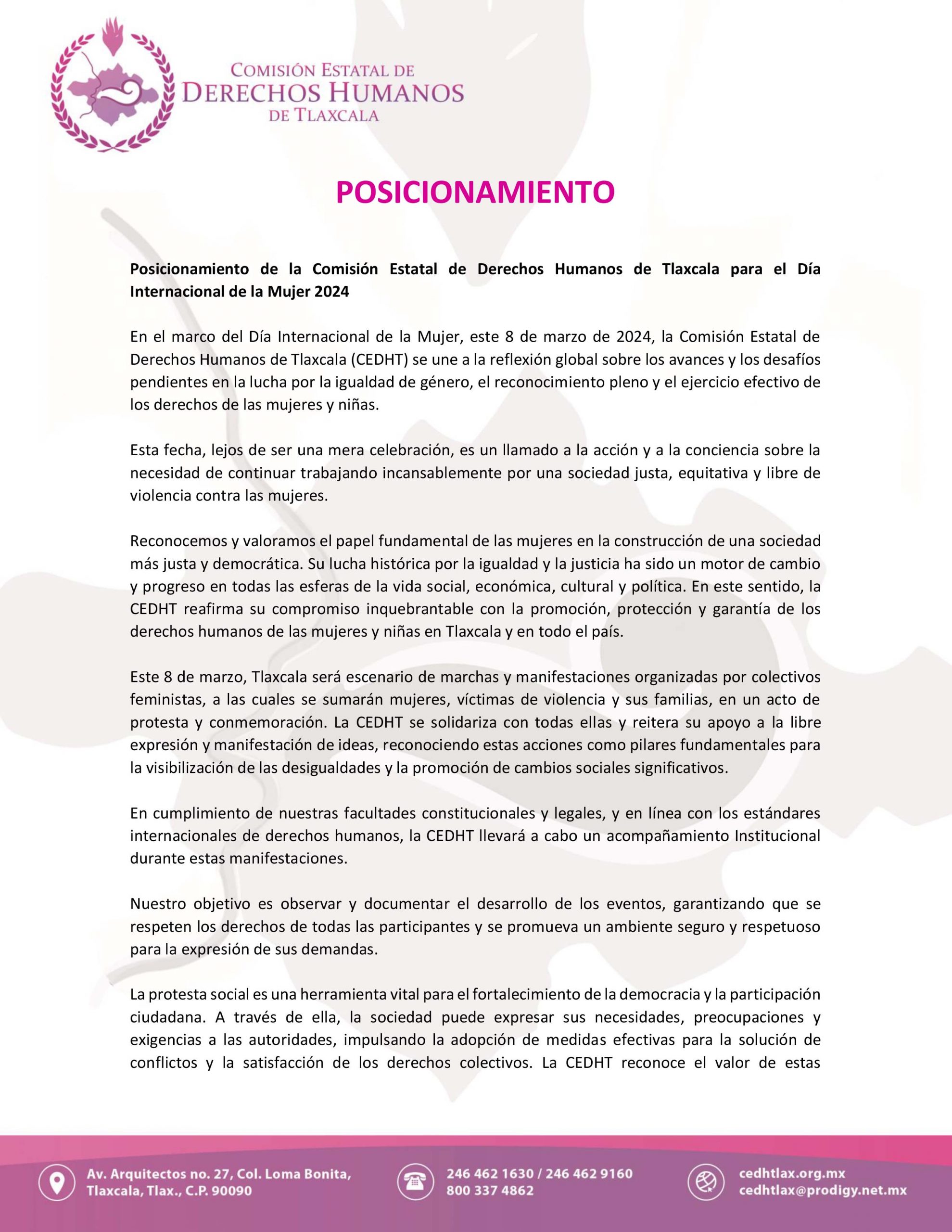 Este 8 de marzo, Tlaxcala será escenario de marchas y manifestaciones organizadas por colectivos feministas, a las cuales se sumarán mujeres, víctimas de violencia y sus familias, en un acto de protesta y conmemoración. La CEDHT se solidariza con todas ellas y reitera su apoyo a la libre expresión y manifestación de ideas, reconociendo estas acciones como pilares fundamentales para la visibilización de las desigualdades y la promoción de cambios sociales significativos.