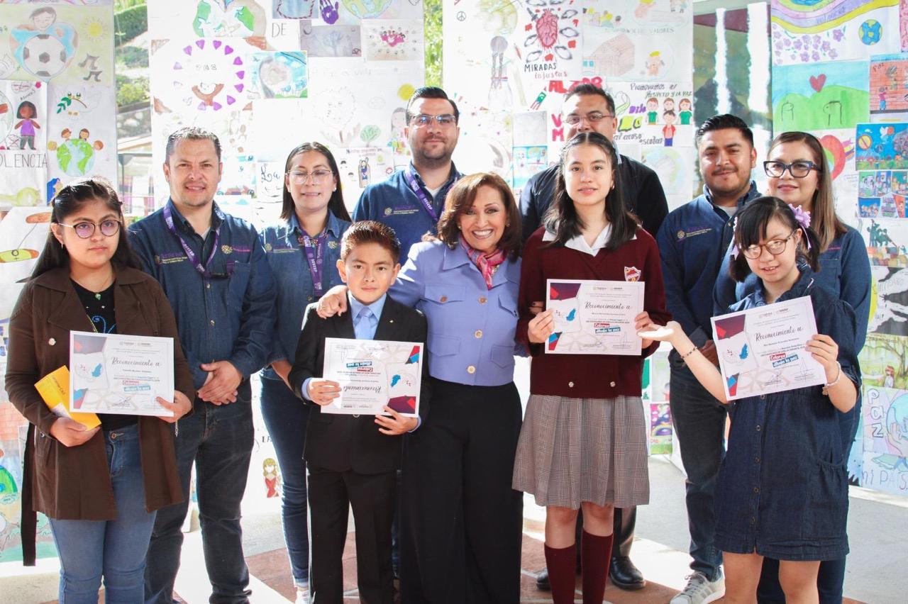 Tlaxcala, Tlax; 15 de mayo de 2025 (PulsoRed) La gobernadora Lorena Cuéllar Cisneros e integrantes del Gabinete de Seguridad de Tlaxcala, premiaron a los tres ganadores y entregaron una mención honorifica a los galardonados del primer concurso de dibujo “Colorea el cambio, dibuja la paz”, organizado por el Secretariado Ejecutivo del Sistema Estatal de Seguridad Pública (SESESP).