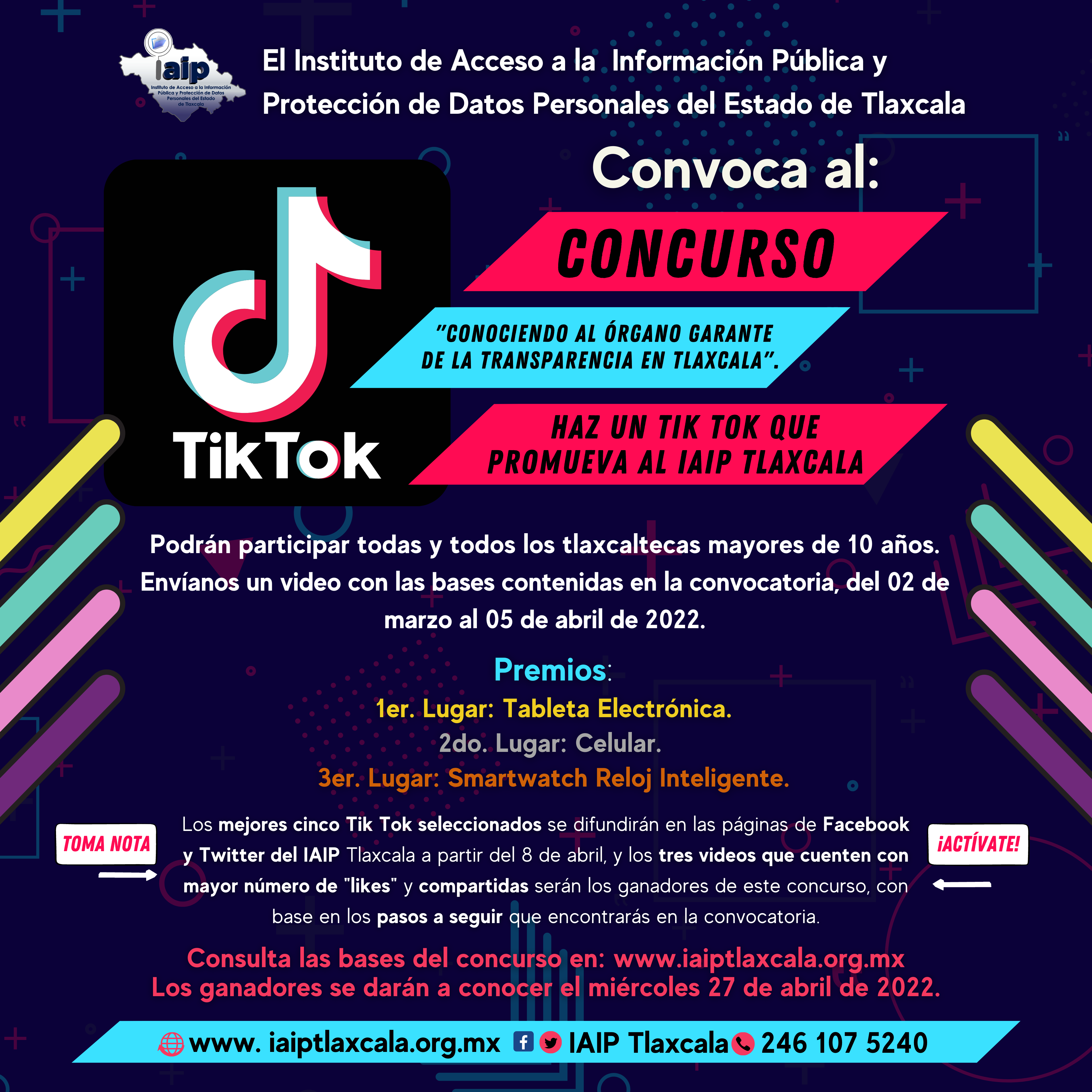 Tlaxcala, Tlax; 29 de marzo de 2022 (PulsoRed) El Instituto de Acceso a la Información Pública y Protección de Datos Personales (IAIP) convocó a la población mayor de 10 años en el estado de Tlaxcala a participar en la convocatoria de concurso de Tik Tok, cuyo objeto es la recepción de trabajos que promuevan al órgano garante y los derechos que tutela.