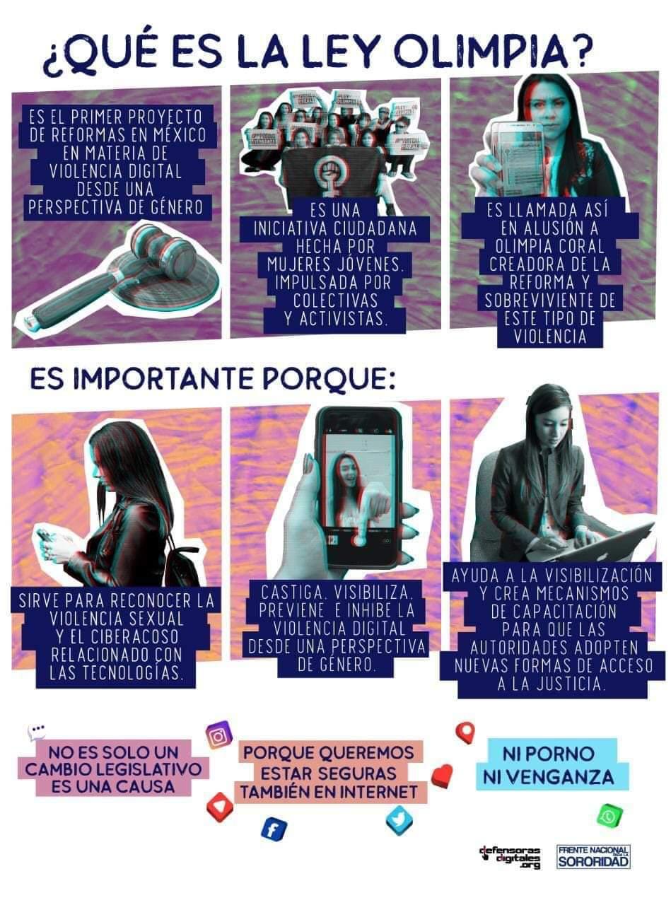 La Ley Olimpia es llamada así en alusión a su autora, Olimpia Coral Melo, quien, tras haber sido víctima de la difusión de un video intimo en 2013, impulsa la reforma en diferentes estados del país junto con el Frente Nacional para la Sororidad, el que está conformado por colectivos feministas de todo el país; cabe mencionar que este es el primer proyecto de reformas en México en materia de violencia digital desde una perspectiva de género.