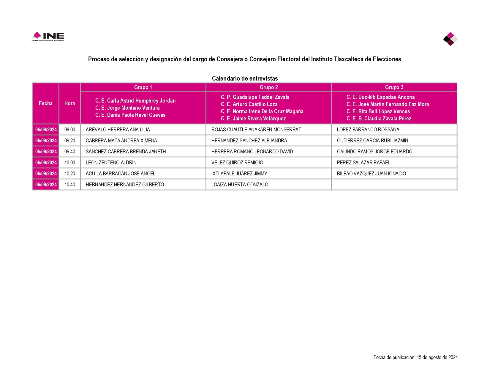 El listado correspondiente a Tlaxcala fue publicado en días pasados mediante el micrositio alojado en la página oficial del INE: https://ine.mx/voto-y-elecciones/opl/convocatoria-opl-2024/, en el que se señala, además de la fecha, la hora, el nombre de la o el sustentante, así como el grupo de Consejeras y Consejeros del INE que examinarán a las personas aspirantes.