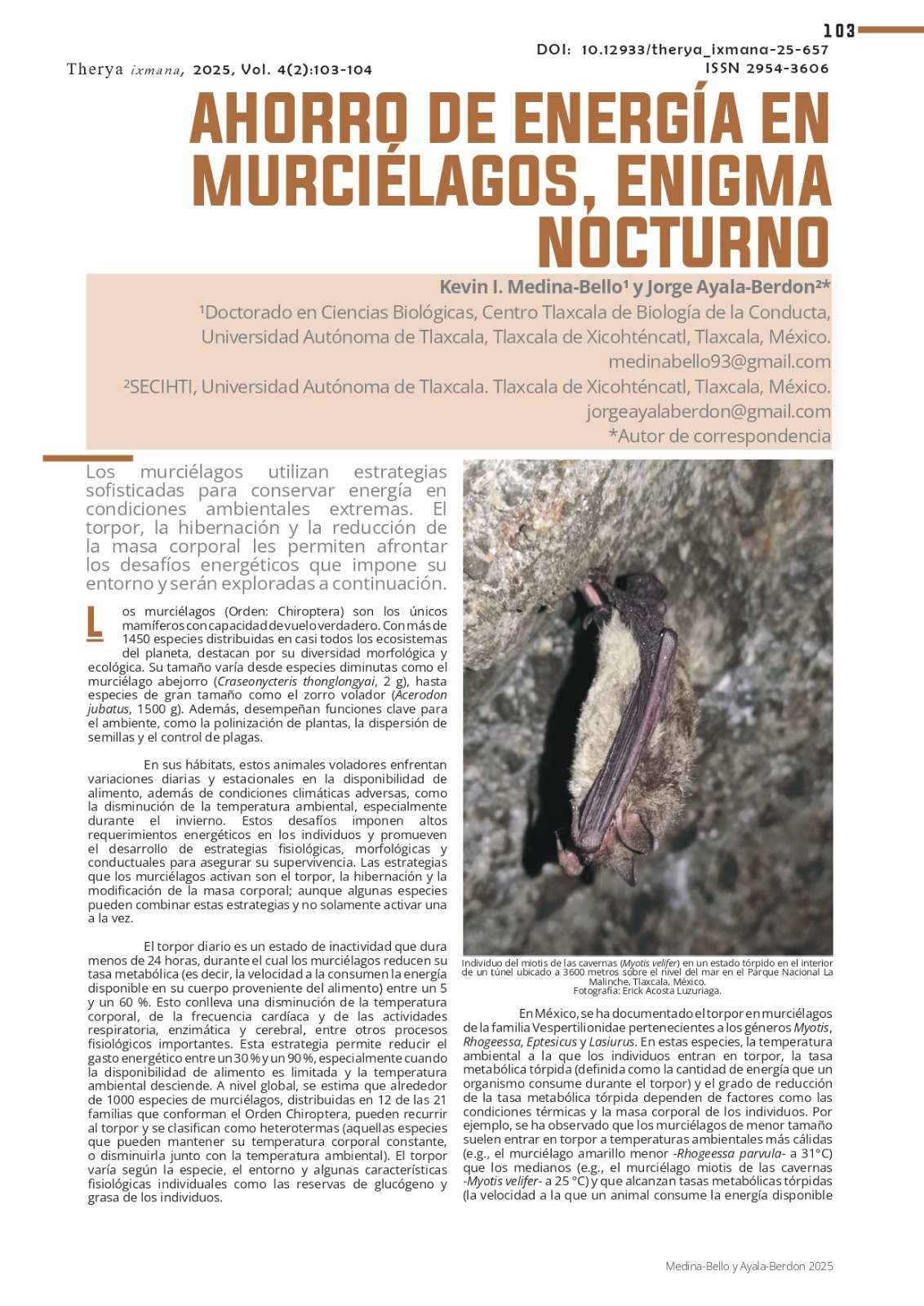 Tlaxcala, Tlax; 20 de marzo de 2025 (PulsoRed) Investigadores del Centro Tlaxcala de Biología de la Conducta (CTBC) de la Universidad Autónoma de Tlaxcala (UATx) publicaron un artículo sobre 𝐀𝐡𝐨𝐫𝐫𝐨 𝐝𝐞 𝐞𝐧𝐞𝐫𝐠𝐢́𝐚 𝐞𝐧 𝐦𝐮𝐫𝐜𝐢𝐞́𝐥𝐚𝐠𝐨𝐬, 𝐞𝐧𝐢𝐠𝐦𝐚 𝐧𝐨𝐜𝐭𝐮𝐫𝐧𝐨 en la revista de divulgación científica 𝐓𝐡𝐞𝐫𝐲𝐚 𝐢𝐱𝐦𝐚𝐧𝐚, en el que describen cómo es la vida de estos mamíferos nocturnos y su sobrevivencia en determinadas regiones de México.