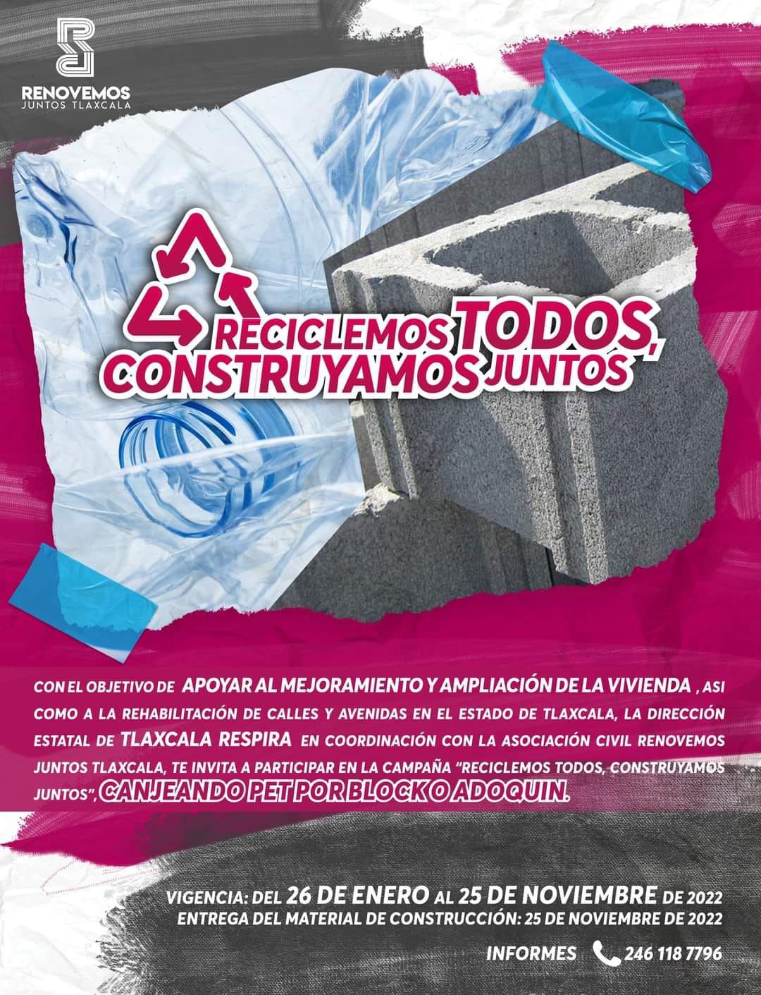 Gestionando el apoyar a la ciudadanía en el mejoramiento y ampliación de vivienda pone en marcha su campaña “Reciclemos todos, construyamos juntos” el cual consiste en cambiar PET por block o adoquín, que será del 26 de enero al 25 de noviembre del 2022.