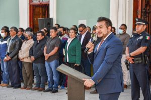 Frente al Palacio del Ayuntamiento, el edil de Huamantla señaló que desde pequeños se debe fomentar el amor y respeto a los tres símbolos patrios, que son la Bandera nacional, el escudo y el himno, que representan la historia y la soberanía de México.