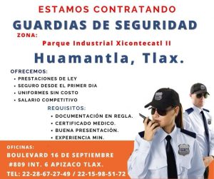 Huamantla, Tlax; 12 de enero de 2024 (PulsoRed) El H. Ayuntamiento de Huamantla, que preside Salvador Santos Cedillo, en colaboración con el Parque Industrial Xicohténcatl II, abre una invitación a hombres y mujeres mayores de 18 años para participar en el proceso de reclutamiento de guardias de seguridad.