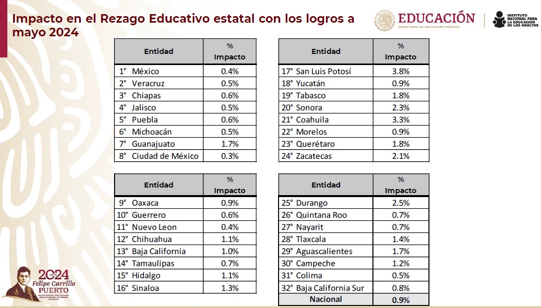 Tlaxcala, Tlax; 07 de junio de 2024 (PulsoRed) De acuerdo con el seguimiento programático por entidad federativa que realiza el Instituto Nacional para la Educación de los Adultos (INEA), el Estado de Tlaxcala ocupó en el mes de mayo el segundo lugar nacional en cumplimiento de metas institucionales, con un avance del 53.6 por ciento.