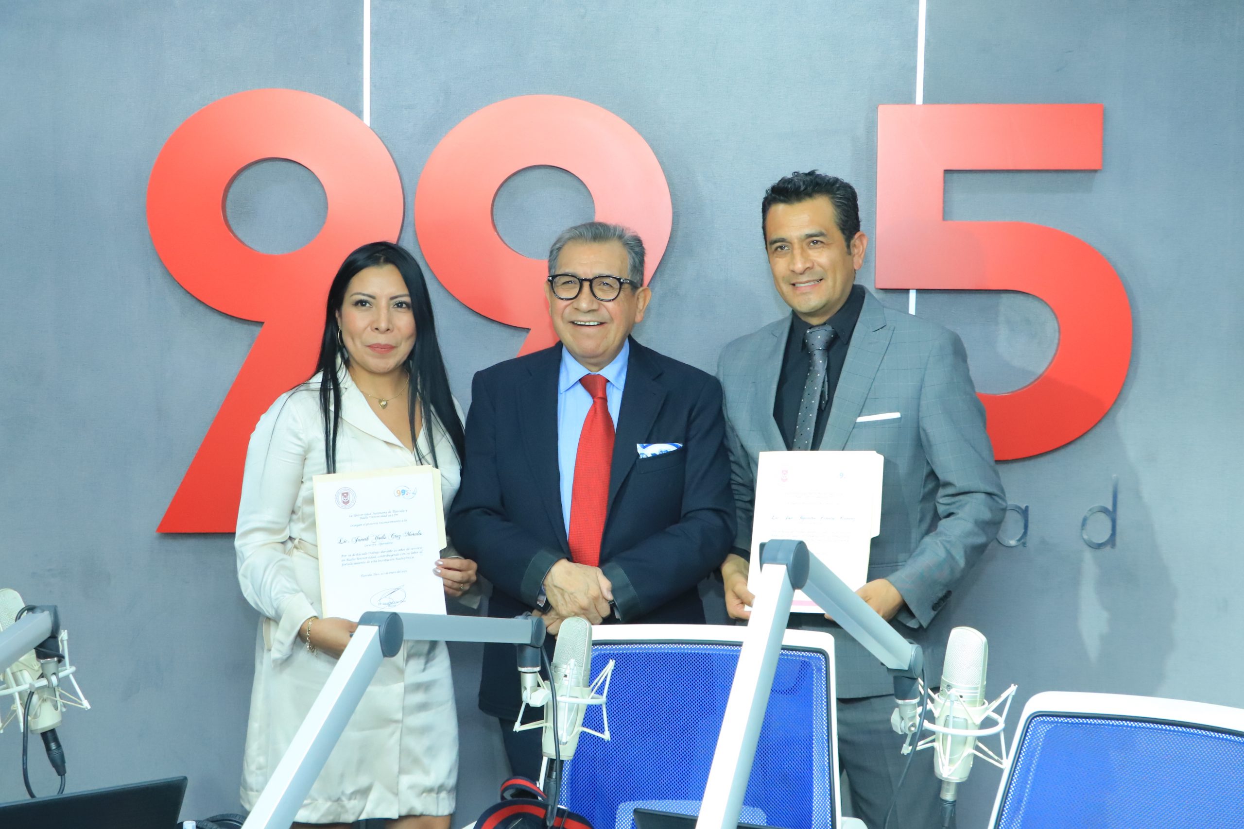 Durante su estancia, el Rector entregó sendos reconocimientos por 20 años de actividad en Radio Universidad a Yudis Cruz, con amplia trayectoria en la locución, y a Alejandro Paredes, Jefe de Información.
