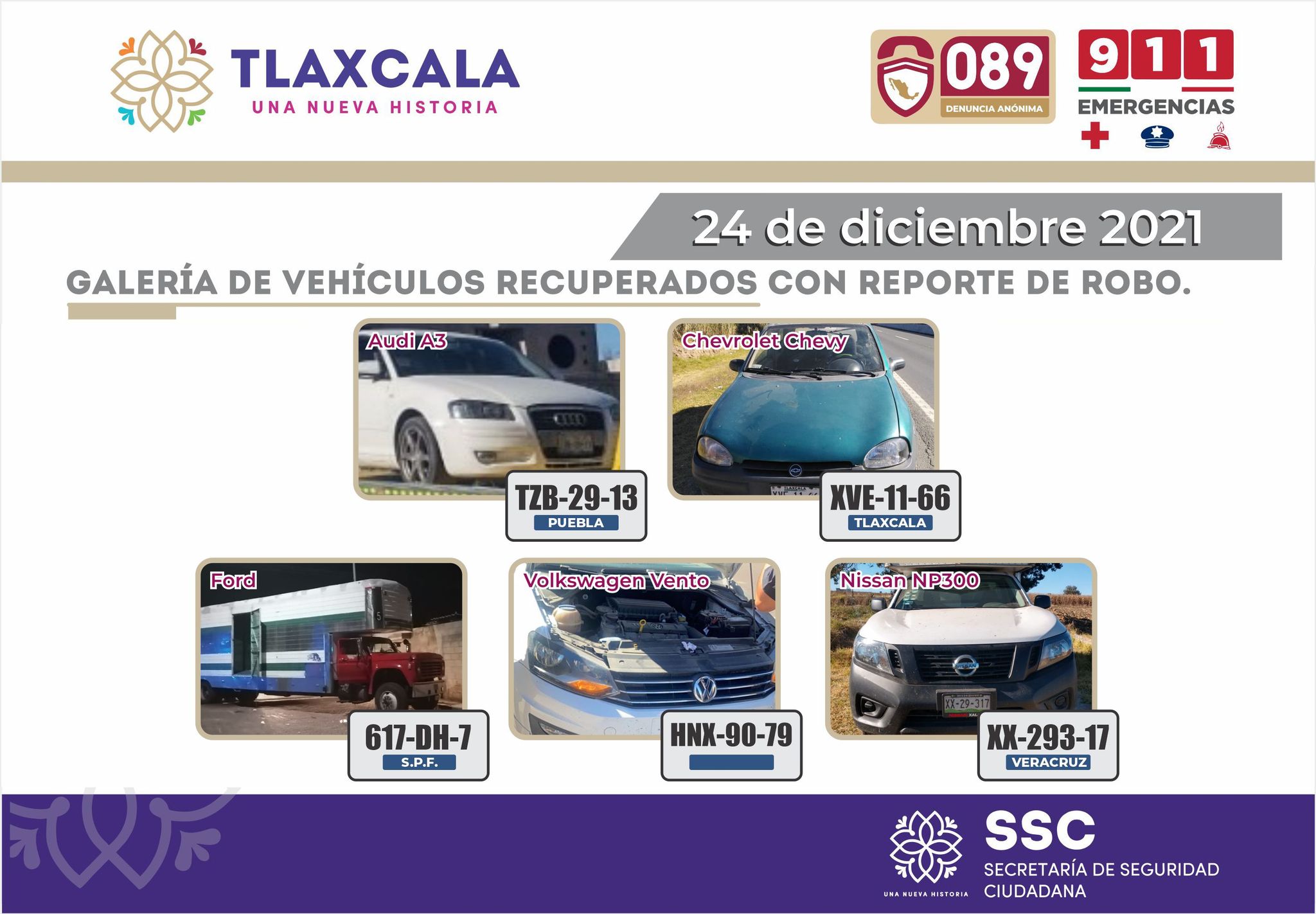 Estas acciones se llevaron a cabo en los municipios de Lázaro Cárdenas, Apizaco, Tlaxcala, Chiautempan y Yauhquemehcan. De esta manera, elementos de la SSC recuperaron un camión Ford tipo mudanza, una camioneta Nissan NP300, una unidad de la marca Volkswagen tipo Vento, un vehículo Audi A3 y un Chevrolet Chevy.