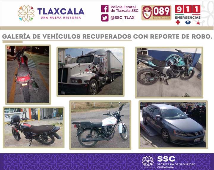Las acciones tuvieron lugar en los municipios de Tepeyanco, Huamantla, Nanacamilpa, Papalotla, Nativitas y El Carmen Tequexquitla, donde elementos de la SSC recuperaron las siguientes unidades; en acciones distintas, 4 motocicletas, la primera de la marca Veloci, una Vento modelo 150cc, una Italika FT150 y una Yamaha 150cc, además se aseguró un tractocamión Kenworth modelo T3, y un Volkswagen modelo Jetta.