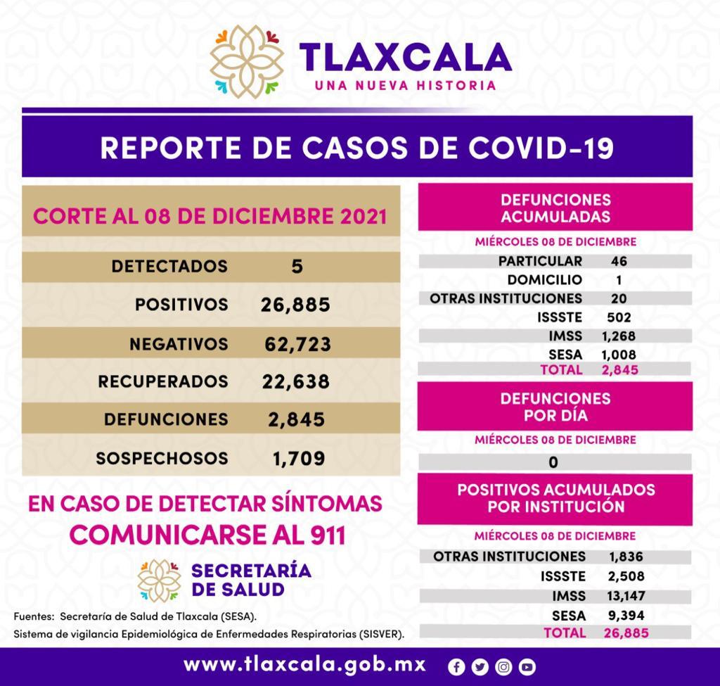 Santa Isabel Xiloxoxtla 75, Zitlaltepec 75, San Damián Texoloc 72, San José Teacalco 80, Atlangatepec 73, Santa Apolonia Teacalco 66, Sanctórum 57, Mazatecochco 53, Lázaro Cárdenas 59, Muñoz de Domingo Arenas 53, Santa Cruz Quilehtla 52, Españita 47, San Lucas Tecopilco 35, Benito Juárez 30 y Emiliano Zapata 18, datos acumulados en lo que va de la pandemia de 2020 al miércoles 08 de diciembre de 2021.