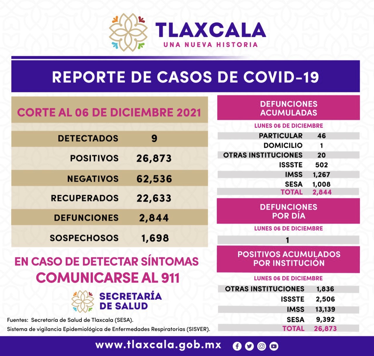 Los datos de la SESA registrados en la plataforma nacional del Sistema de Vigilancia Epidemiológica de Enfermedades Respiratorias (Sisver), confirmaron 9 casos positivos de Covid-19 y una defunción el 06 de diciembre de 2021.