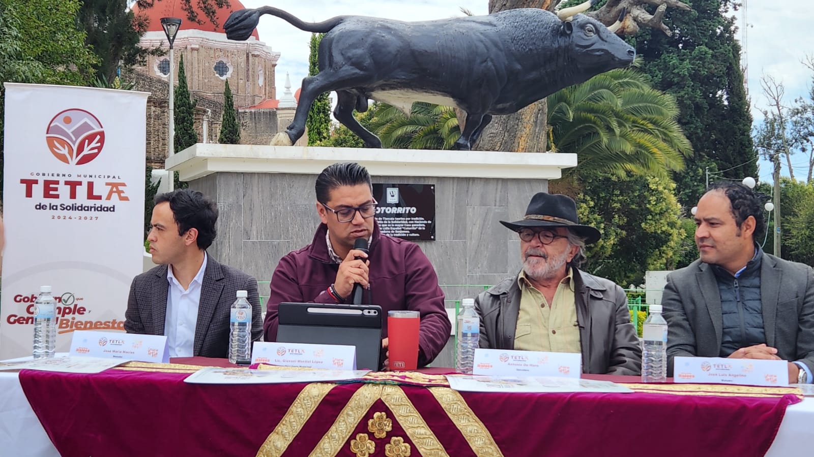 Tlaxcala, Tlax; 27 de junio de 2025 (David Rodríguez) Luego de dos años de ausencia de festejos taurinos en el municipio de Tetla, el alcalde Giovani Montiel López presentó este jueves el cartel de la corrida de feria en honor a Santiago Apóstol, que se llevará a cabo el 27 de julio en la plaza “Don Raúl González”.