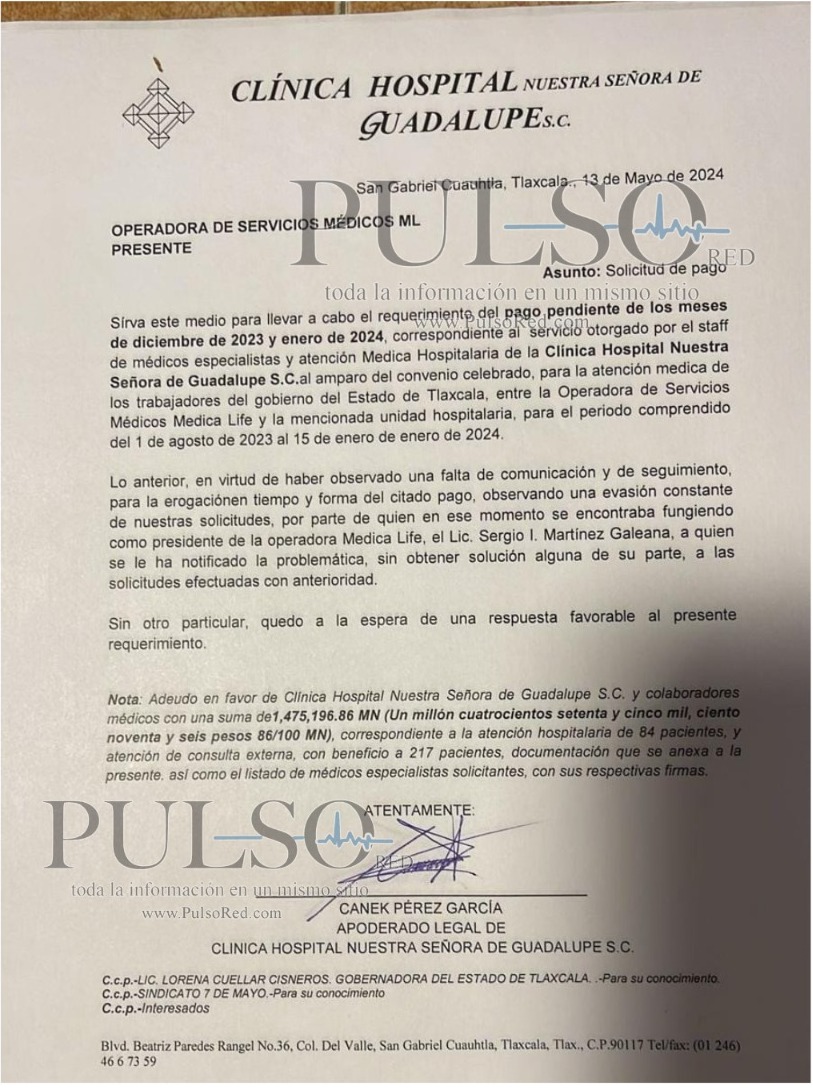 Tlaxcala, Tlax; 14 de mayo de 2024 (Selene Sosa) Por la suma de un millón 475 mil 196.86 pesos, la Clínica Hospital Nuestra Señora de Guadalupe S.C. hizo llegar al despacho de la Gobernadora del Estado, Lorena Cuéllar Cisneros, un requerimiento de pago, derivado de la deuda adquirida del 1 de agosto de 2023 al 15 de enero de 2024.