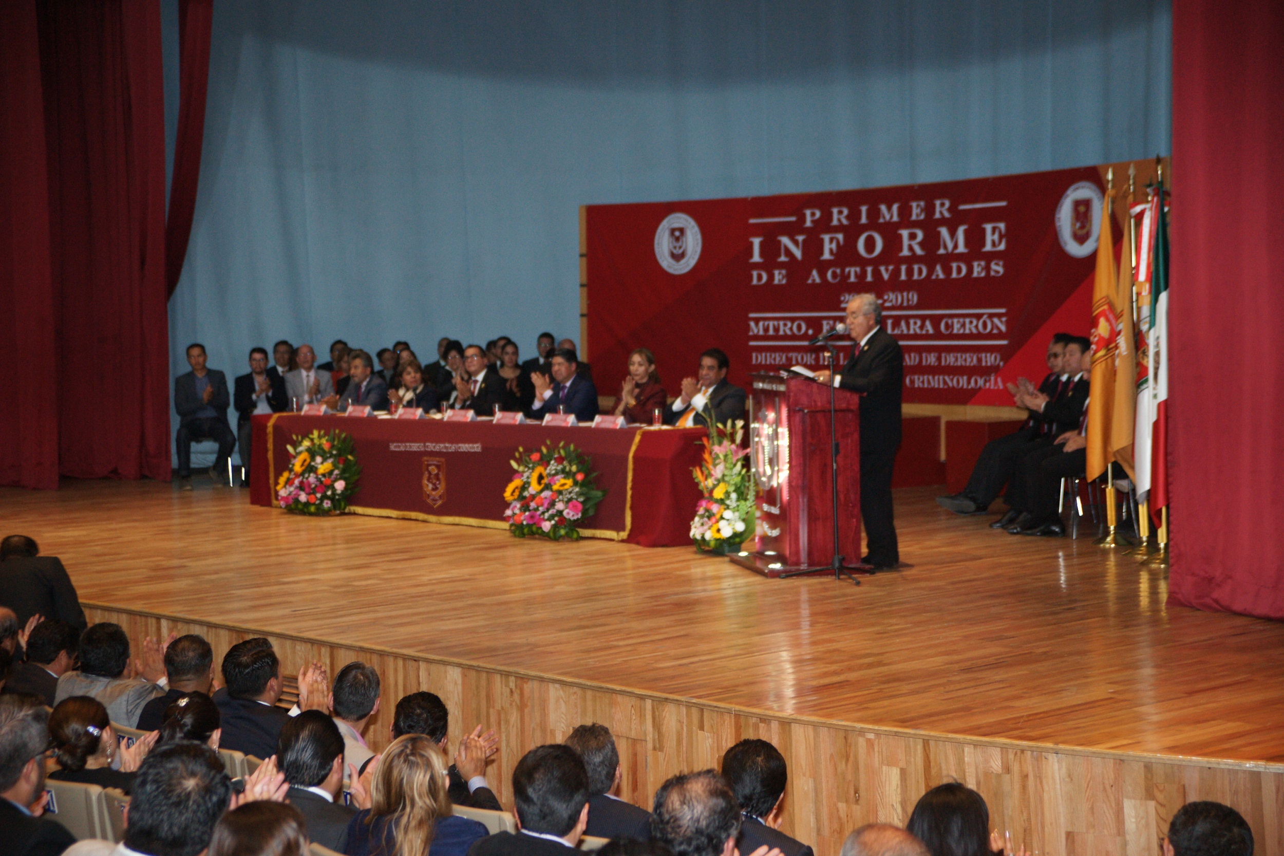 Tlaxcala, Tlax; 29 de octubre de 2019 (Pulso) “Las Instituciones de Educación Superior son la medula de una sociedad, en ellas, se gesta la actualización del saber, permitiendo que los individuos cambien paradigmas, tener un pensamiento proactivo y generar una renovada actitud que impulse a descubrir nuevos horizontes”, sostuvo el Dr. Enrique Vázquez Fernández, Secretario Académico de la Universidad Autónoma de Tlaxcala (UATx) y representante personal del Rector, Dr. Luis González Placencia, en el 1er. Informe de actividades del Mtro. Fabio Lara Cerón, Director de la Facultad de Derecho, Ciencias Políticas y Criminología.