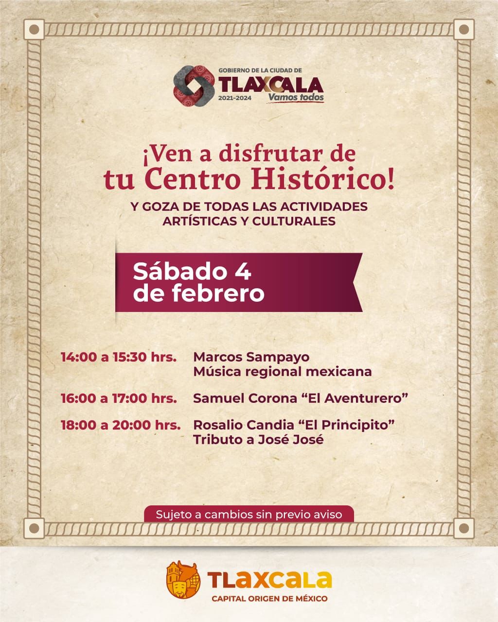 Para este sábado 4 de febrero, el escenario que se ubica en la Plaza de la Constitución de Tlaxcala, vibrará a partir de las 14:00 horas con la música regional mexicana a cargo de Marcos Sampayo, talento local.