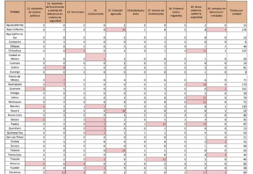 “Mutilación, descuartizamiento y destrucción de cadáveres”, “Asesinato de funcionarios y actores de relevancia en materia de seguridad”, “Linchamiento” y “actos violentos contra la autoridad” se colocaron en el sexto lugar con con dos eventos cada uno y un solo caso de “Esclavitud y trata”.