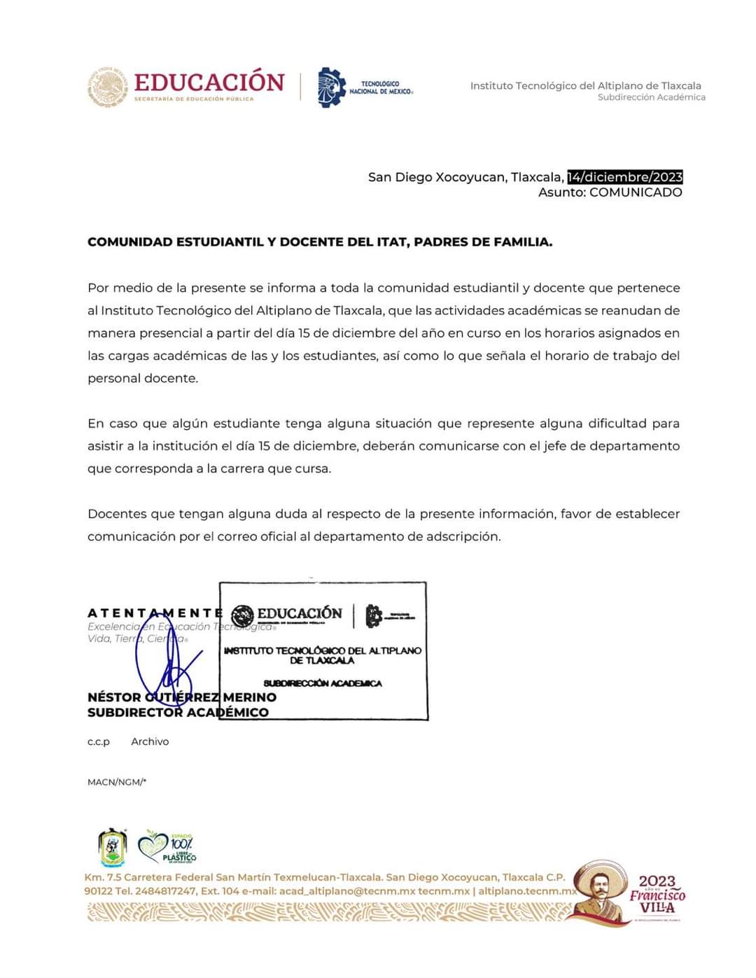 Tlaxcala, Tlax; 15 de diciembre de 2023 (Selene Sosa) Con la promesa de atender su pliego petitorio, la Subdirección Académica del Tecnológico Nacional de México (TecNM) emitió un comunicado para que la comunidad estudiantil y el plantel docente reanudaran clases este viernes 15 de diciembre del año en curso.