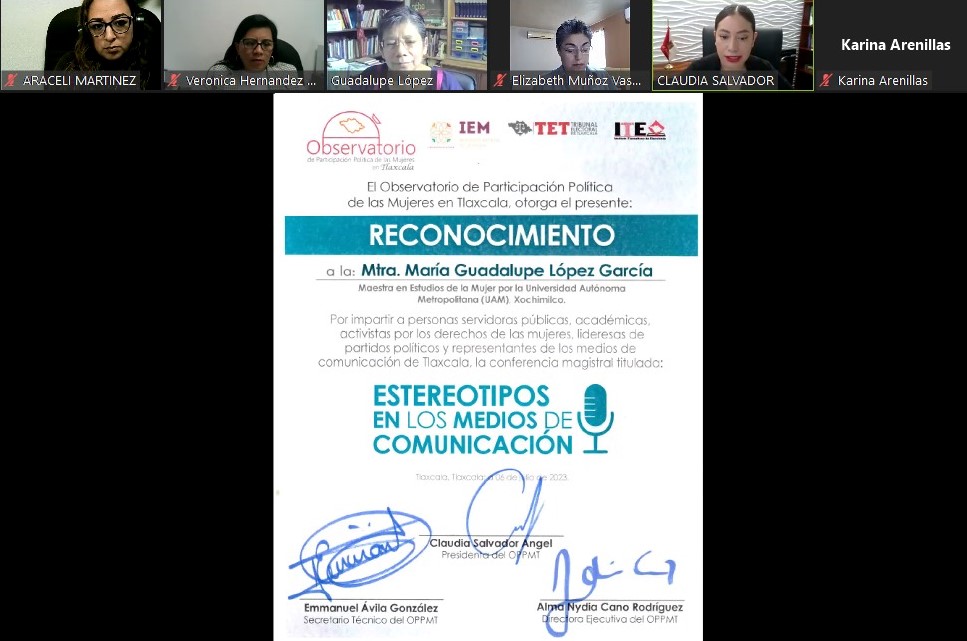 Tlaxcala, Tlax; 06 de julio de 2023 (PulsoRed) En la conferencia magistral virtual “Estereotipos en los Medios de Comunicación” organizada por el Observatorio de Participación Política de las Mujeres en Tlaxcala (OPPMT), la especialista María Guadalupe López García señaló que los medios de comunicación pueden contribuir a impulsar la igualdad de género y a erradicar la violencia contra las mujeres