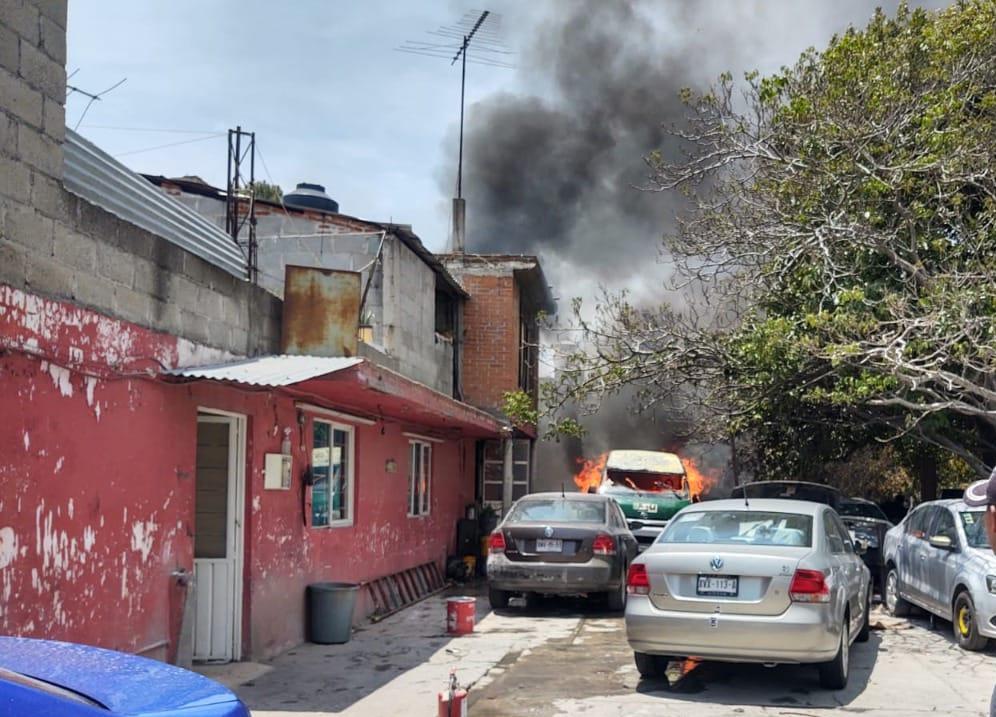Tlaxcala, Tlax; 10 de abril de 2022 (Ariadna Castro) Cuatro personas con quemaduras de diferentes grados dejó una explosión de una unidad de transporte público sobre la calle roble de la colonia El Sabinal, municipio de Tlaxcala.