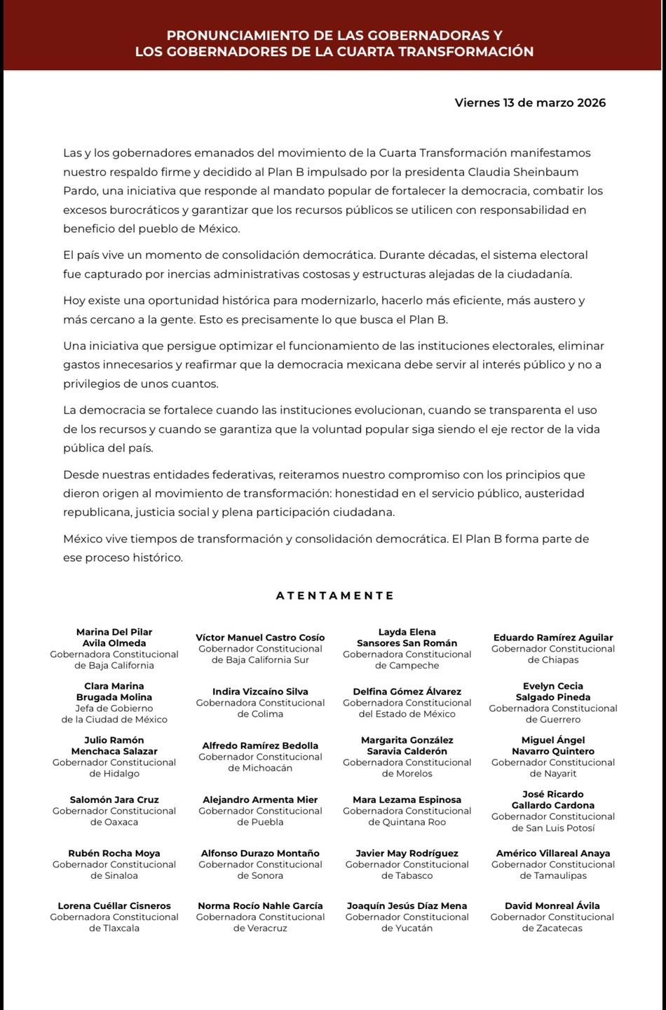 A través de un pronunciamiento conjunto emitido este viernes 13 de marzo de 2026, las y los gobernadores destacaron que esta iniciativa responde al mandato popular de mejorar el funcionamiento de las instituciones electorales, reducir excesos burocráticos y acercar el sistema democrático a la ciudadanía.