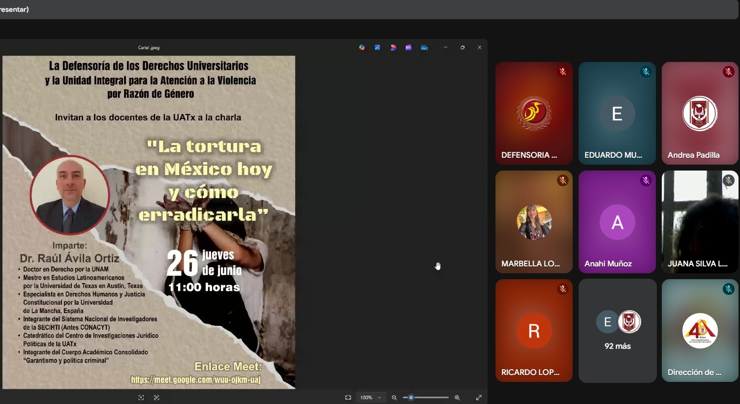 Tlaxcala, Tlax; 27 de junio de 2025 (PulsoRed) La Defensoría de los Derechos Humanos y la Unidad Integral para la Atención a la Violencia por Razón de Género de la Universidad Autónoma de Tlaxcala (UATx) organizaron la conferencia 𝐋𝐚 𝐭𝐨𝐫𝐭𝐮𝐫𝐚 𝐞𝐧 𝐌𝐞́𝐱𝐢𝐜𝐨 𝐡𝐨𝐲 𝐲 𝐜𝐨́𝐦𝐨 𝐞𝐫𝐫𝐚𝐝𝐢𝐜𝐚𝐫𝐥𝐚, que impartió el Doctor Raúl Ávila Ortiz, como parte de la campaña #MéxicoSinTortura2025, impulsada por el Gobierno de México y la Subsecretaría de Derechos Humanos, Población y Migración.