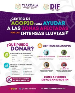 Tlaxcala, Tlax; 13 de octubre de 2025 (PulsoRed) El Sistema Estatal para el Desarrollo Integral de la Familia (Sedif) abrió centros de acopio para reunir víveres y artículos de primera necesidad destinados a apoyar a las familias afectadas por las intensas lluvias en los estados de Veracruz, Puebla, Hidalgo y Tlaxcala.