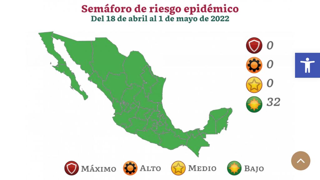 La información difundida en la página de internet oficial del Gobierno de México detalló que las 32 entidades federativas nuevamente estarán en color verde del Semáforo de Riesgo Epidémico Covid-19.