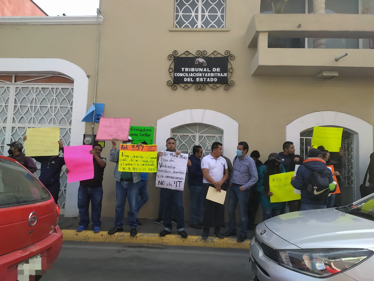 Tlaxcala, Tlax; 31 de mayo de 2023 (Selene Sosa) La mañana de este miércoles, trabajadores y ex trabajadores del Instituto Tecnológico Superior de Tlaxco se manifestaron en las inmediaciones del Tribunal de Conciliación y Arbitraje (TCyA) para exigir que se reconozca su sindicato.