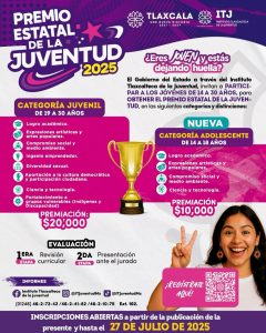 Tlaxcala, Tlax; 16 de julio de 2025 (PulsoRed) El Instituto Tlaxcalteca de la Juventud (ITJ) dio a conocer que la convocatoria para el Premio Estatal de la Juventud 2025 continúa abierta hasta el próximo 27 de junio, galardón que reconoce el talento, compromiso social, académico, artístico, emprendedor de jóvenes que contribuyen al desarrollo de sus comunidades y del estado.