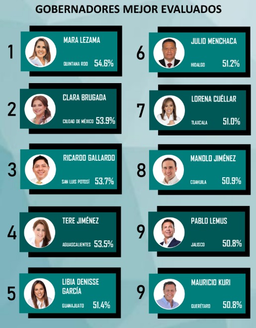 En junio, la medición a cargo de Consulta Mitofsky para El Economista muestra que los mandatarios que mejor califica la ciudadanía son: Mara Lezama, de Quintana Roo (54.6%), Clara Brugada, de la Ciudad de México (53.9%); Ricardo Gallardo, de San Luis Potosí (53.7%); Tere Jiménez, de Aguascalientes (53.5%); Libia Dennise García, de Guanajuato (51.4%); Julio Menchaca, de Hidalgo (51.2%) y Lorena Cuéllar, de Tlaxcala.