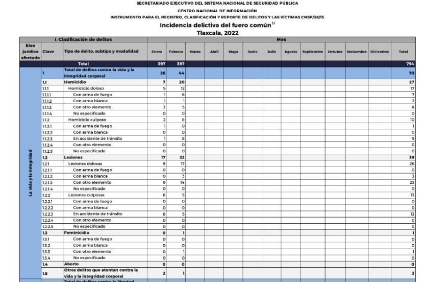 Tlaxcala, Tlax; 24 de marzo de 2022 (Ariadna Castro) Al cierre del mes de febrero, el Secretariado Ejecutivo del Sistema Nacional de Seguridad Pública, reportó que Tlaxcala registró 397 delitos del fuero común; lo que significó que se mantuvo igual que el mes anterior, el cual registró la misma cantidad de delitos.