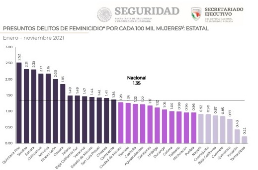 Sin embargo, pese a encontrarse en el top cinco de las entidades con menos casos se encuentra en la media nacional con 1.26 delitos por cada 100 mil mujeres, mientras que la media nacional es de 1.35.